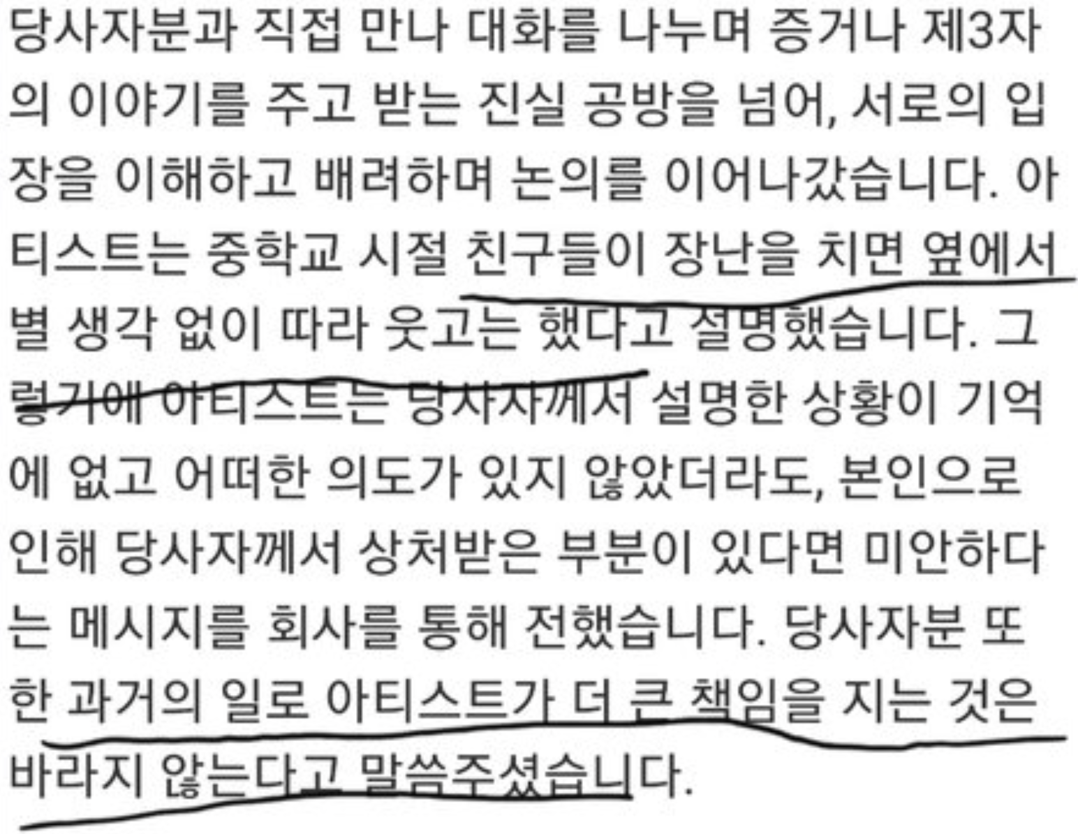 - [+107, -9] So he "allegedly" had a conversation with the victim but its the agency releasing his position, agency releasing his apology, the agency revealing what he wants to say to his fans...